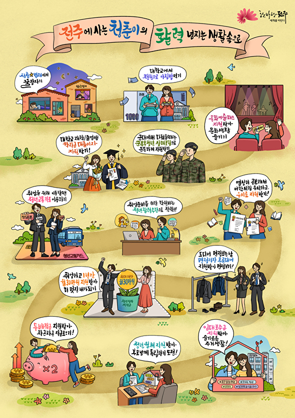 전주시, 내년 청년지원 혜택 대폭 늘린다전북 전주시가 청년이 찾아오고 머물고 싶은 도시로 나아가기 위해 다양한 청년정책의 혜택을 대폭 늘리기로 했다. 시는 청년들의 생활 안정과 지역 정착 기반을 강화하기 위해 ‘2026년 청년 지원사업’을 강화하는 한편, 더 많은 청년이 혜택을 받을 수 있도⋯