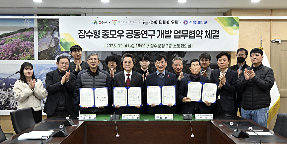 장수군, 장수형 저탄소 종모우 개발 나선다전북 장수군은 장수한우지방공사, 이티바이오텍(주), 전북대학교와 장수군청 회의실에서 장수한우 품질 고급화를 위한 ‘장수형 저탄소 종모우 개발’ 공동연구 상호협력 업무협약(MOU)을 체결했다고 11일 밝혔다. 이번 협약은 협약기관 간 상호 업무협조 체계⋯