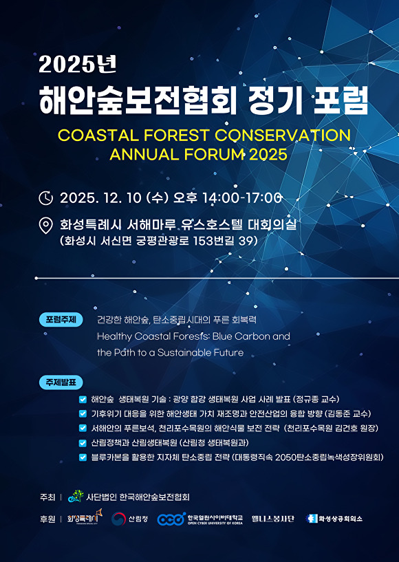 ‘건강한 해안숲 탄소중립의 푸른 회복력’ - 전문가 포럼 열린다탄소중립 시대의 정책 논의가 다시 해안으로 향하고 있다. 사단법인 한국해안숲보전협회는 오는 10일 오후 2시 화성특례시 서해마루 유스호스텔 대회의실에서 ‘2025년 해안숲보전협회 정기 포럼’을 개최한다. 올해 포럼은 ‘건강한 해안숲, 탄소중립시대의 푸른⋯