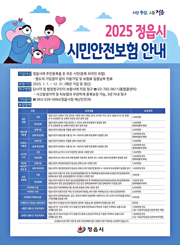 먼저 시민안전보험은 정읍시에 주민등록을 둔 모든 시민이 별도 절차 없이 자동 가입된다.